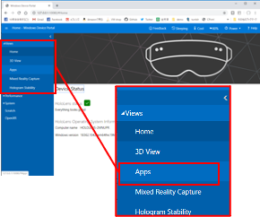前セクションを参考に、HoloLens 2をPCにUSBケーブルで接続して、ブラウザでWindows Device Portalを開きます。