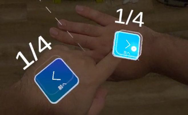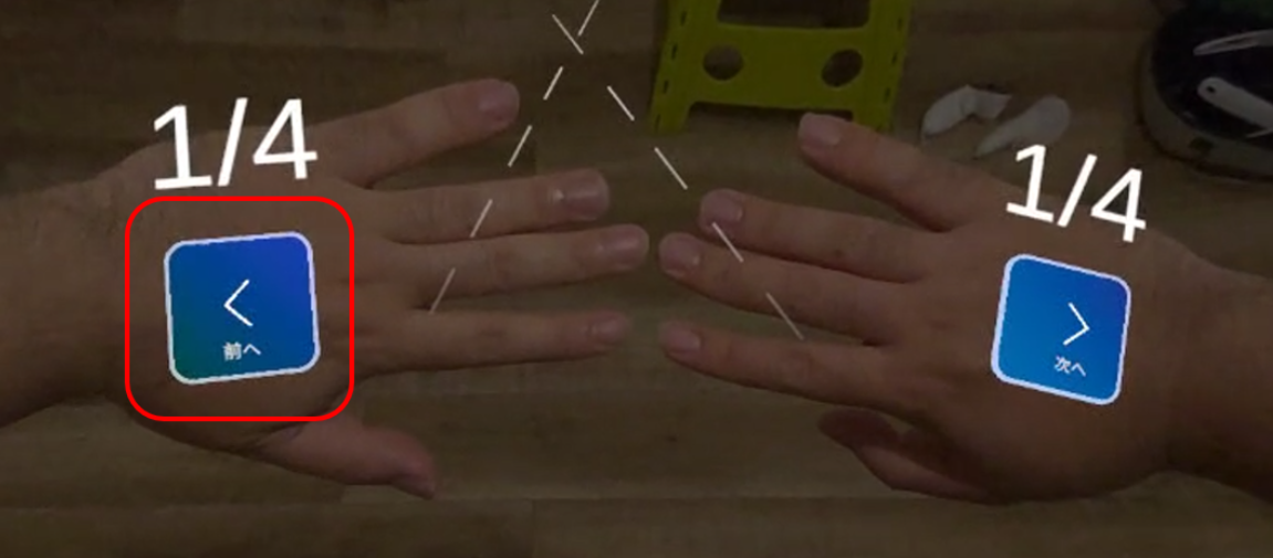 手の甲の上に「前へ」「次へ」ボタンが表示されます。