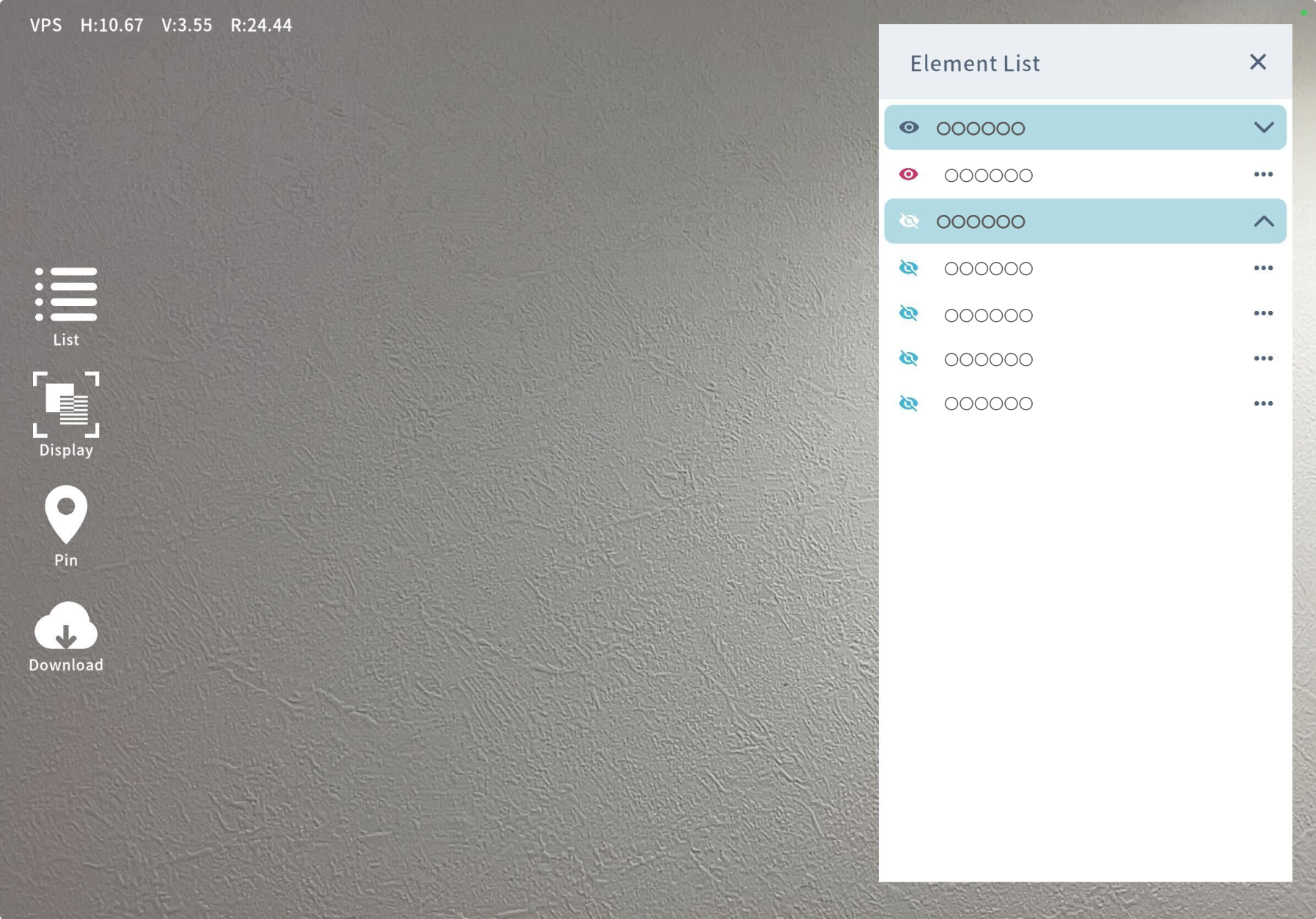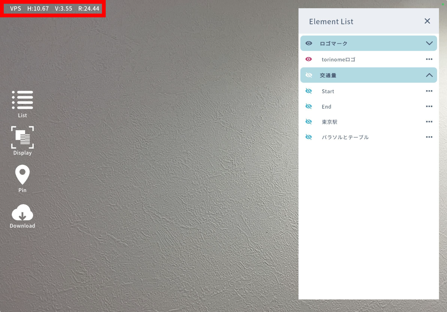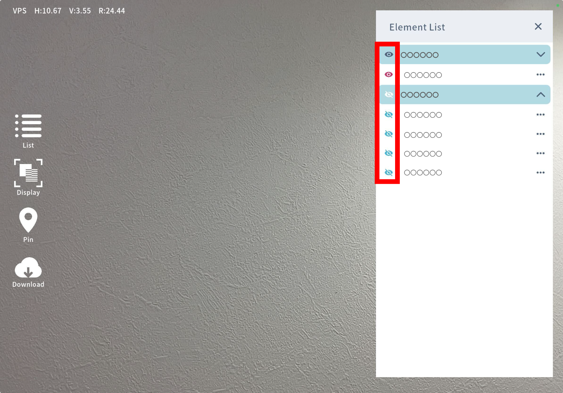 エレメントリストより、表示したいデータの目のマークをタップし、マークから斜線が取れてたことを確認します。