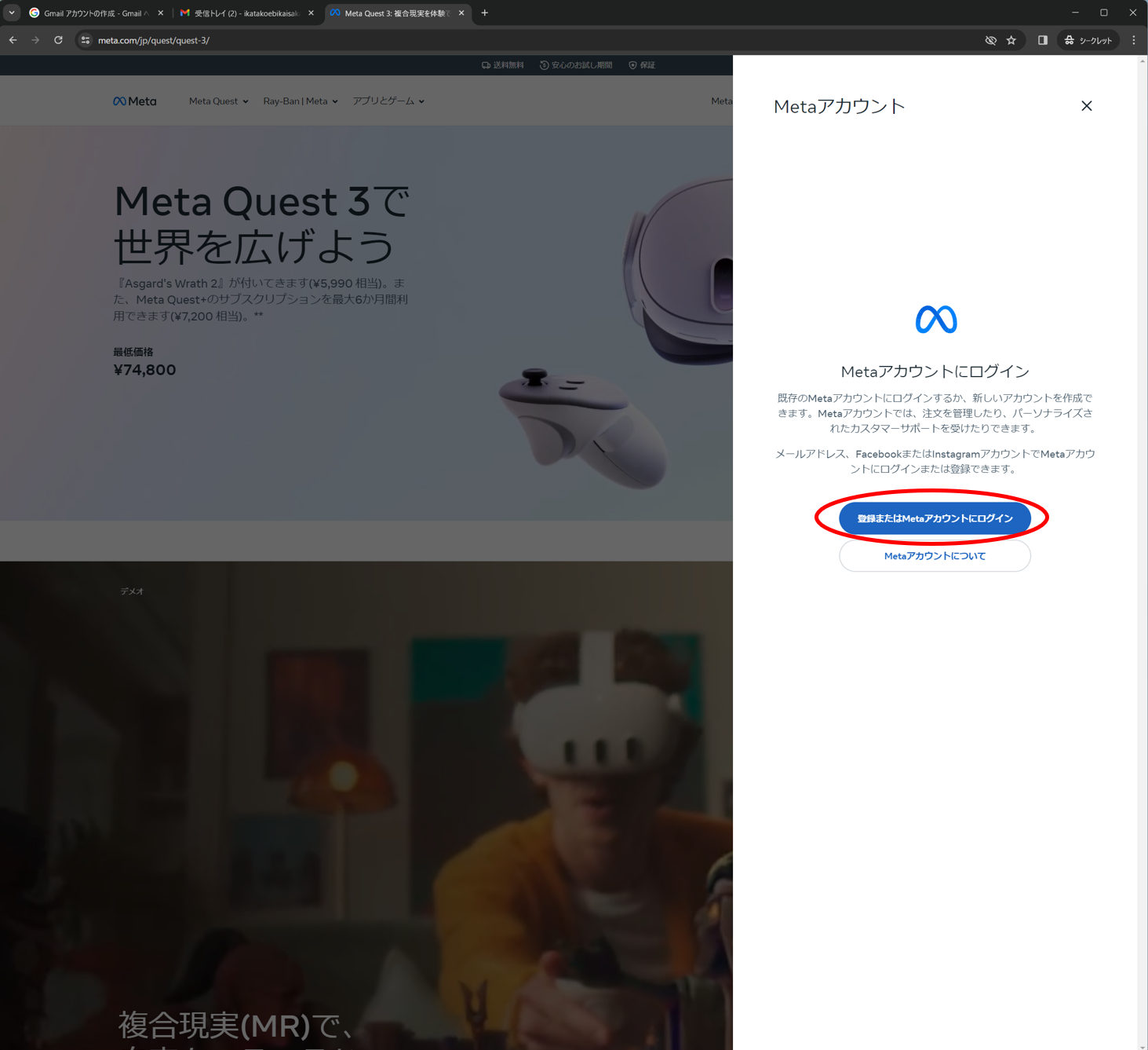 (2) 「登録またはMetaアカウントにログイン」を選択します