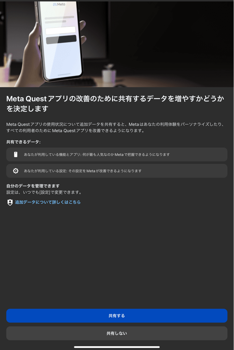 (5)ログイン後、Meta社との共有が表示されるので任意に選択してください(どちらでも動作に影響はありません)