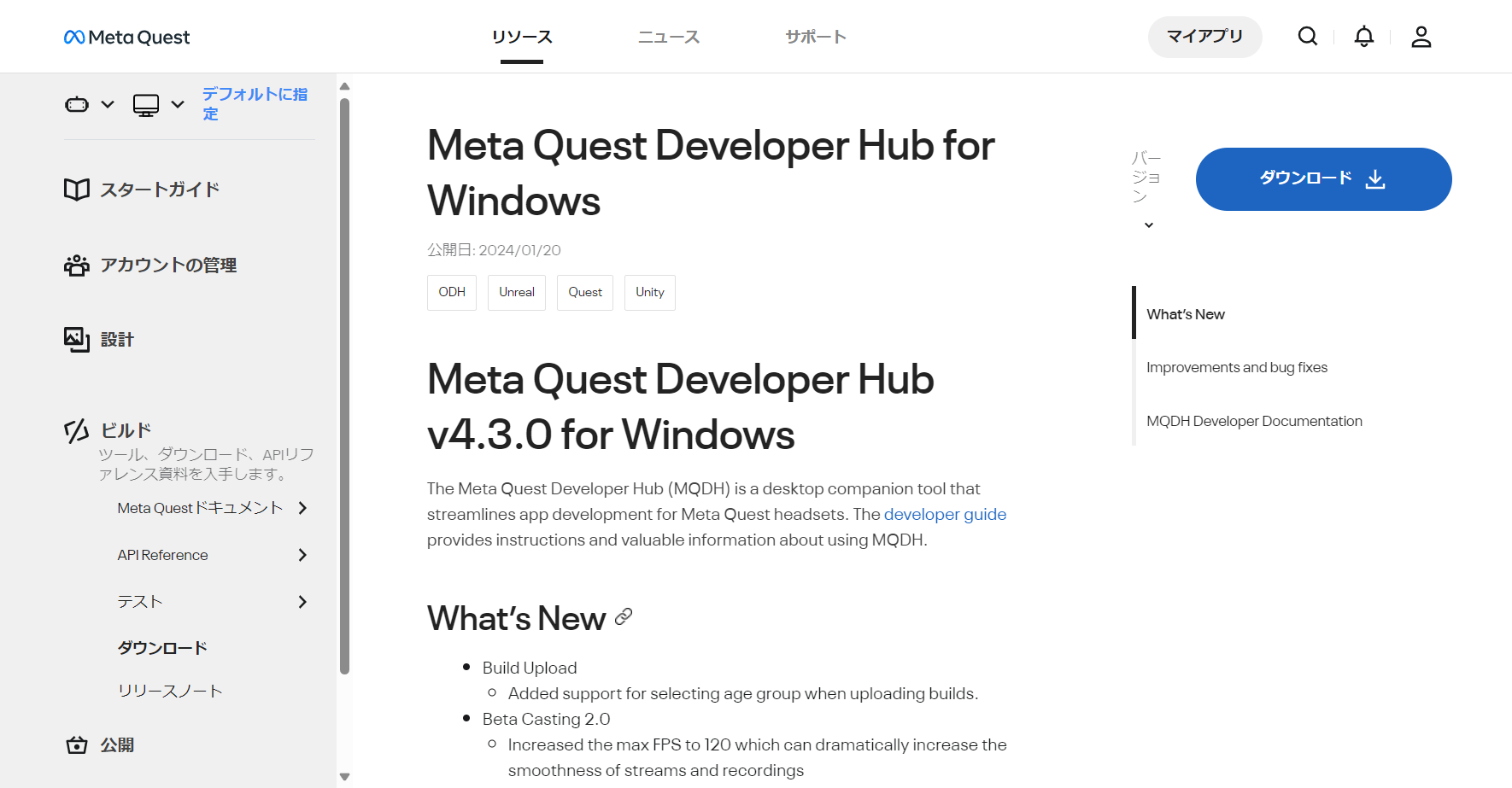 Meta Quest Developer Hub for Windows サイトにアクセスします