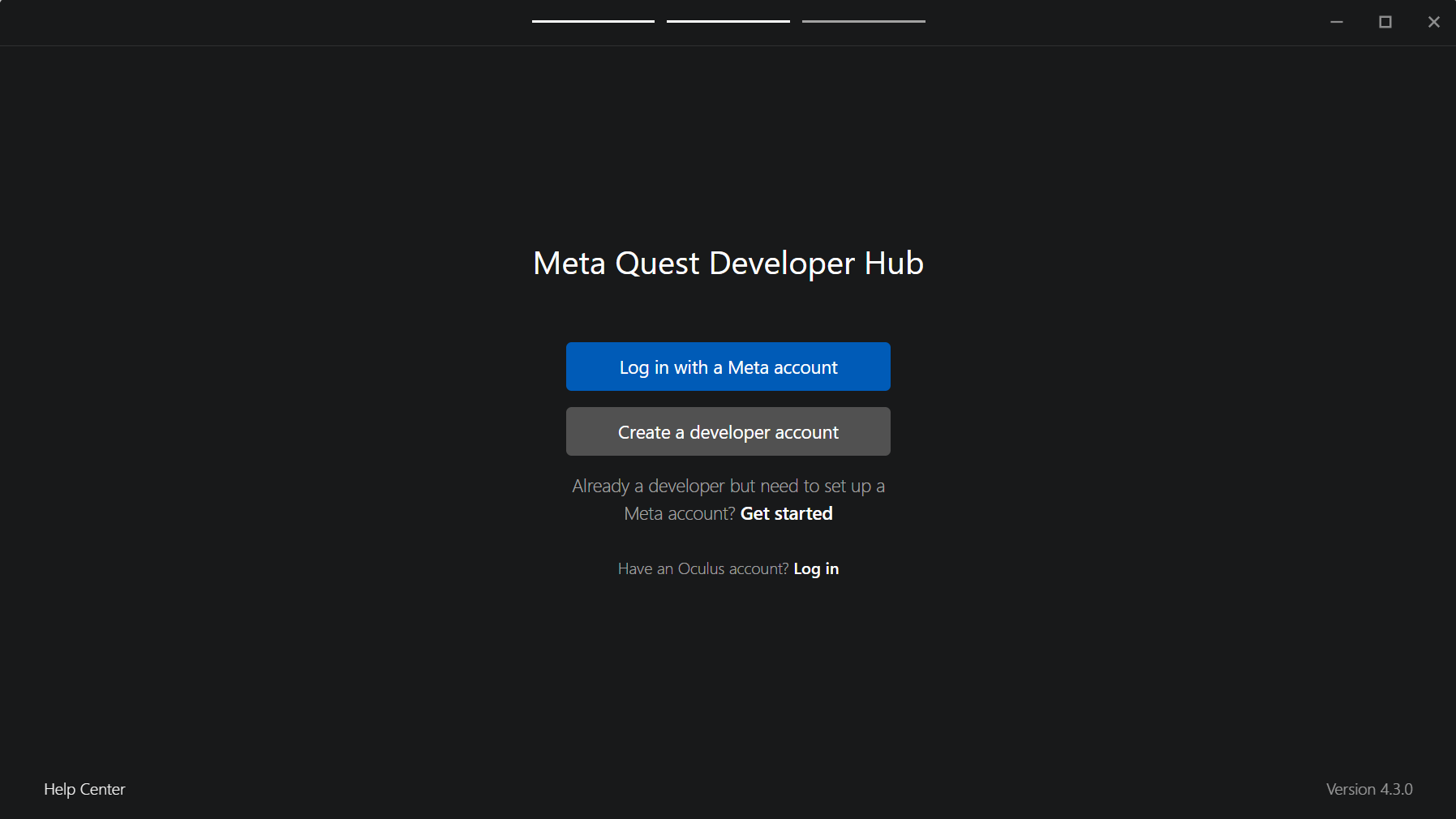 (ここではメールアドレスでログインします) - ログイン後、画面がMeta Quest Developer Hubに戻ります