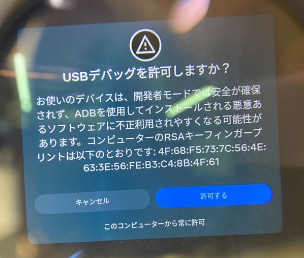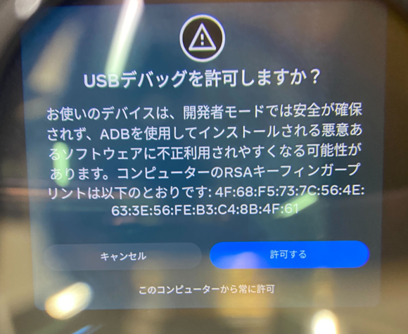 - そのまま再度「USBデバッグを許可しますか?」が表示されるので「このコンピュータから常に許可」を選択します