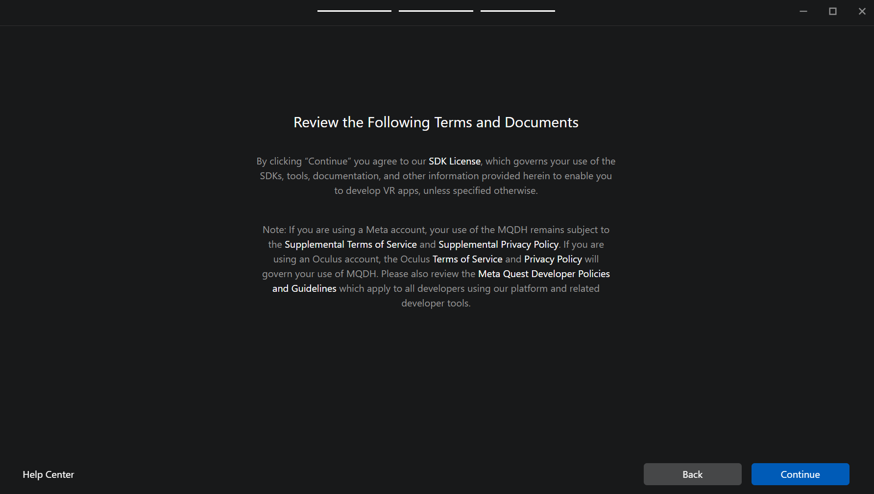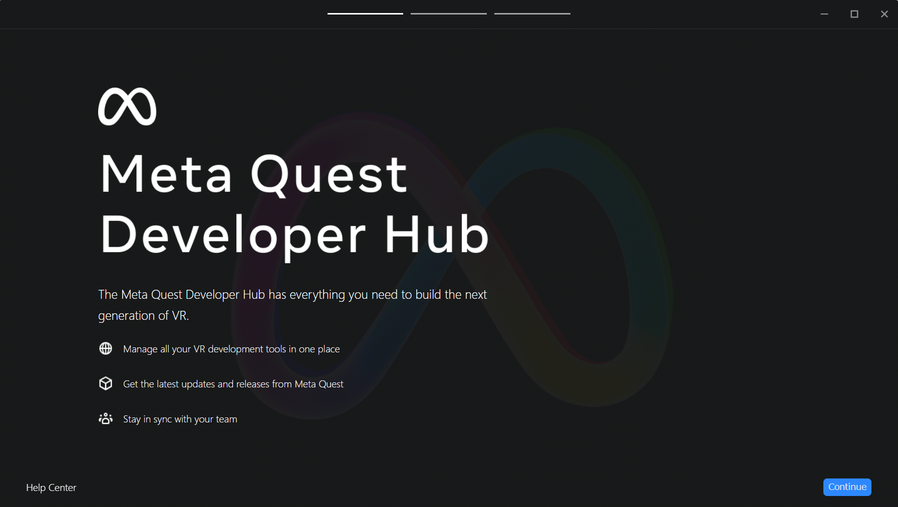 そのままMeta Quest Developer Hubが起動します - 「Continue」を選択します