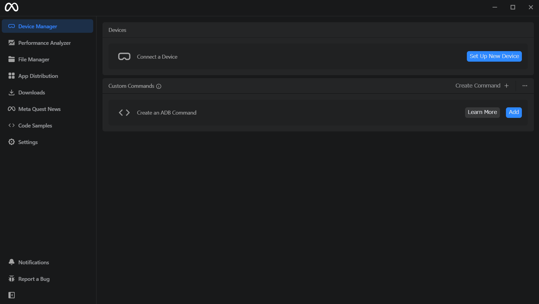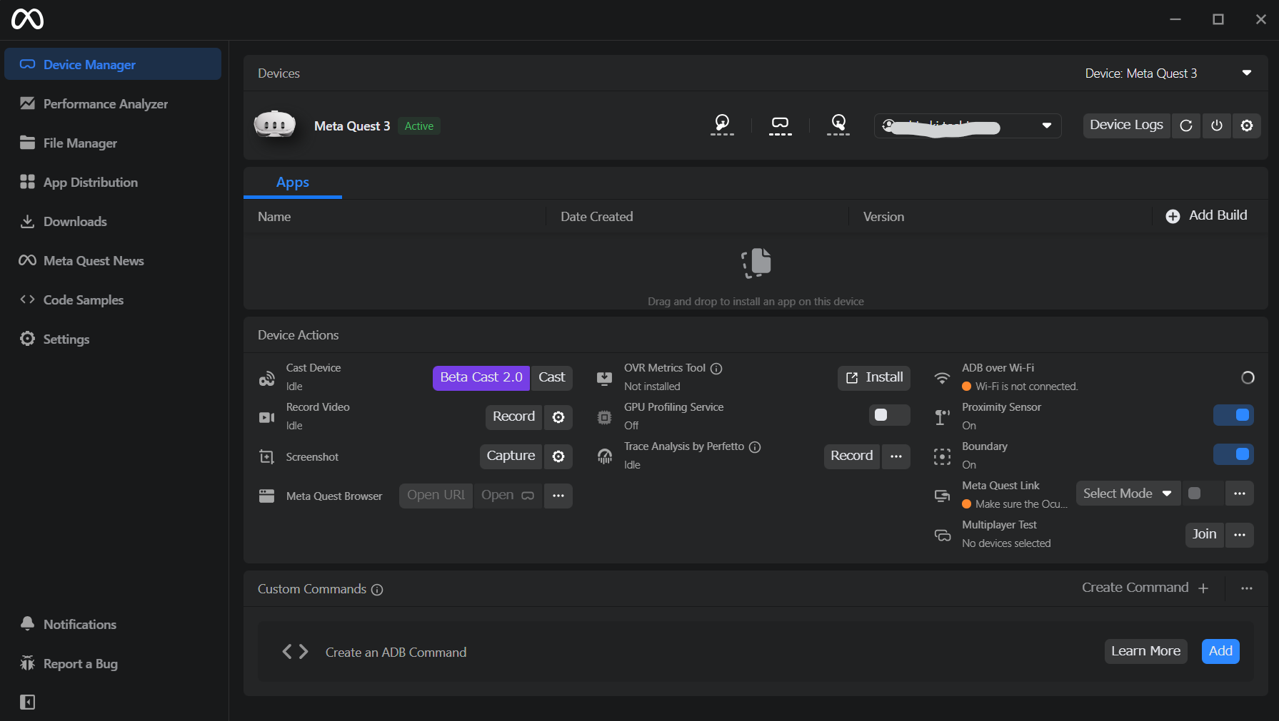 - 右側のメニューから「Device Manager」を選択し、Quest 3とPCをUSBで接続します