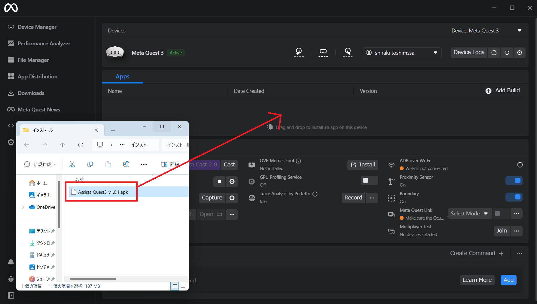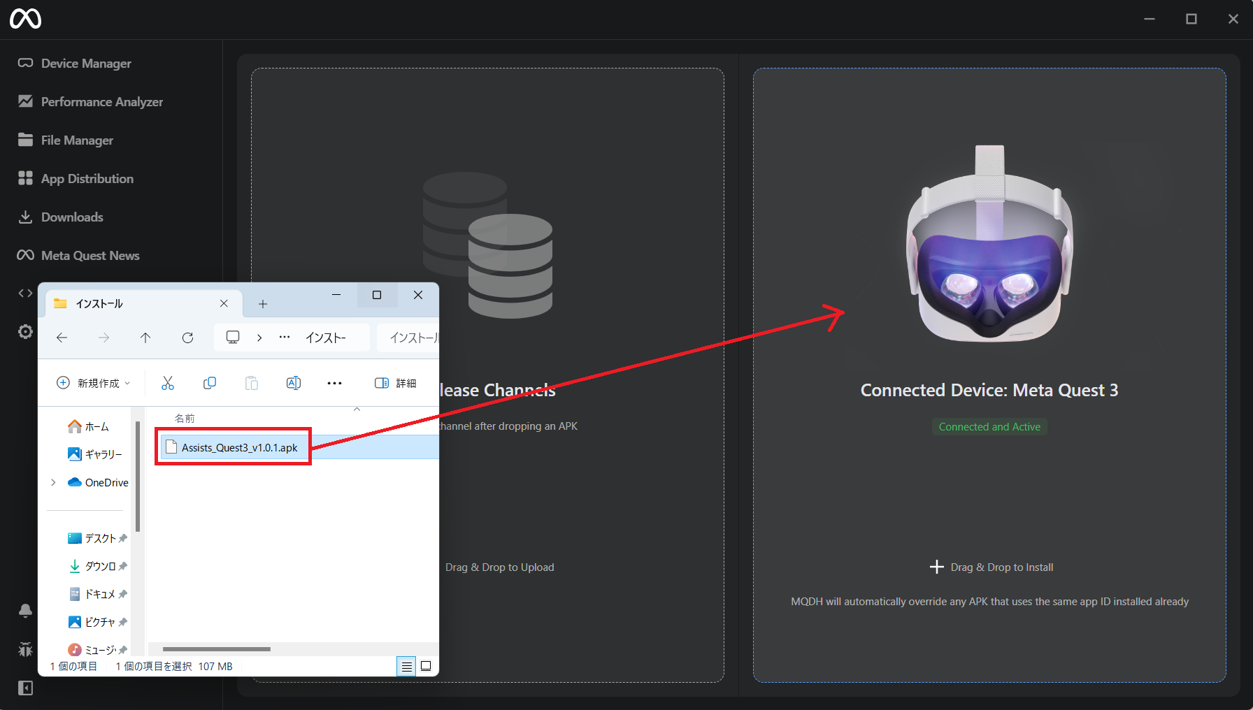 - Assistのアプリケーション(Assists_Quest3_vX.X.X.apk)を Meta Quest Developer Hub にドラッグ&ドロップするとQuest 3が表示されます、そのまま「Connected Device : Meta Quest 3」までドラッグ&ドロップしてください