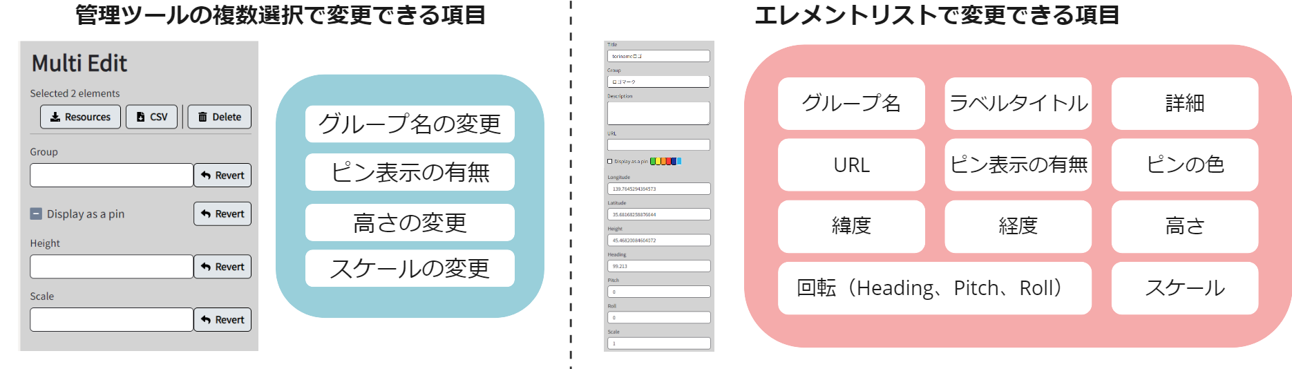エレメント管理ツールでも複数のエレメントに対して、グループ名、ピン表示、高さ、スケールを編集することができますが、エレメントリストでは、各エレメントに対しての編集を同時に行うことができます。