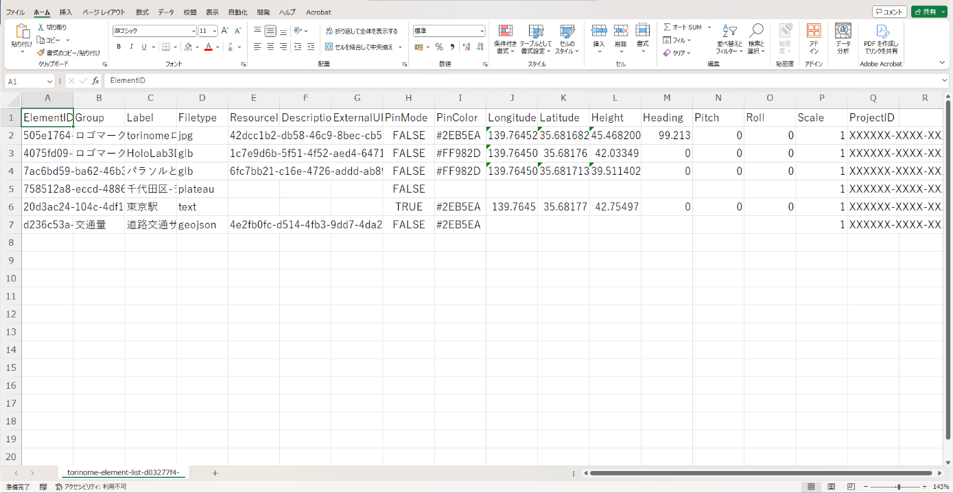 エレメントリストでは、エレメントの位置情報や属性情報などを一覧でみることができます。また、CSV上でエレメントの追加や編集を行うことができます。