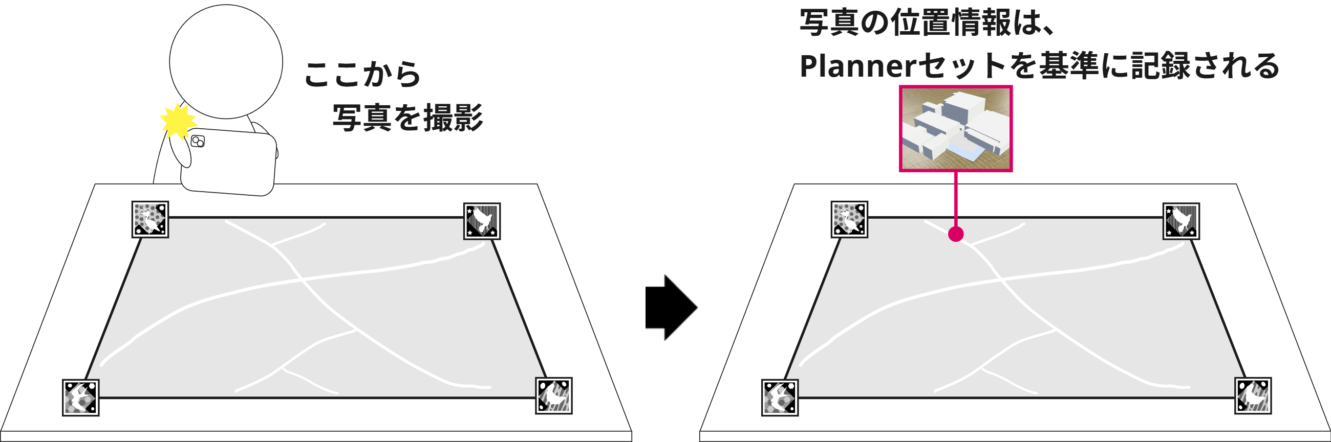 撮影された写真の位置情報は、Plannerセットを基準に記録されます。
