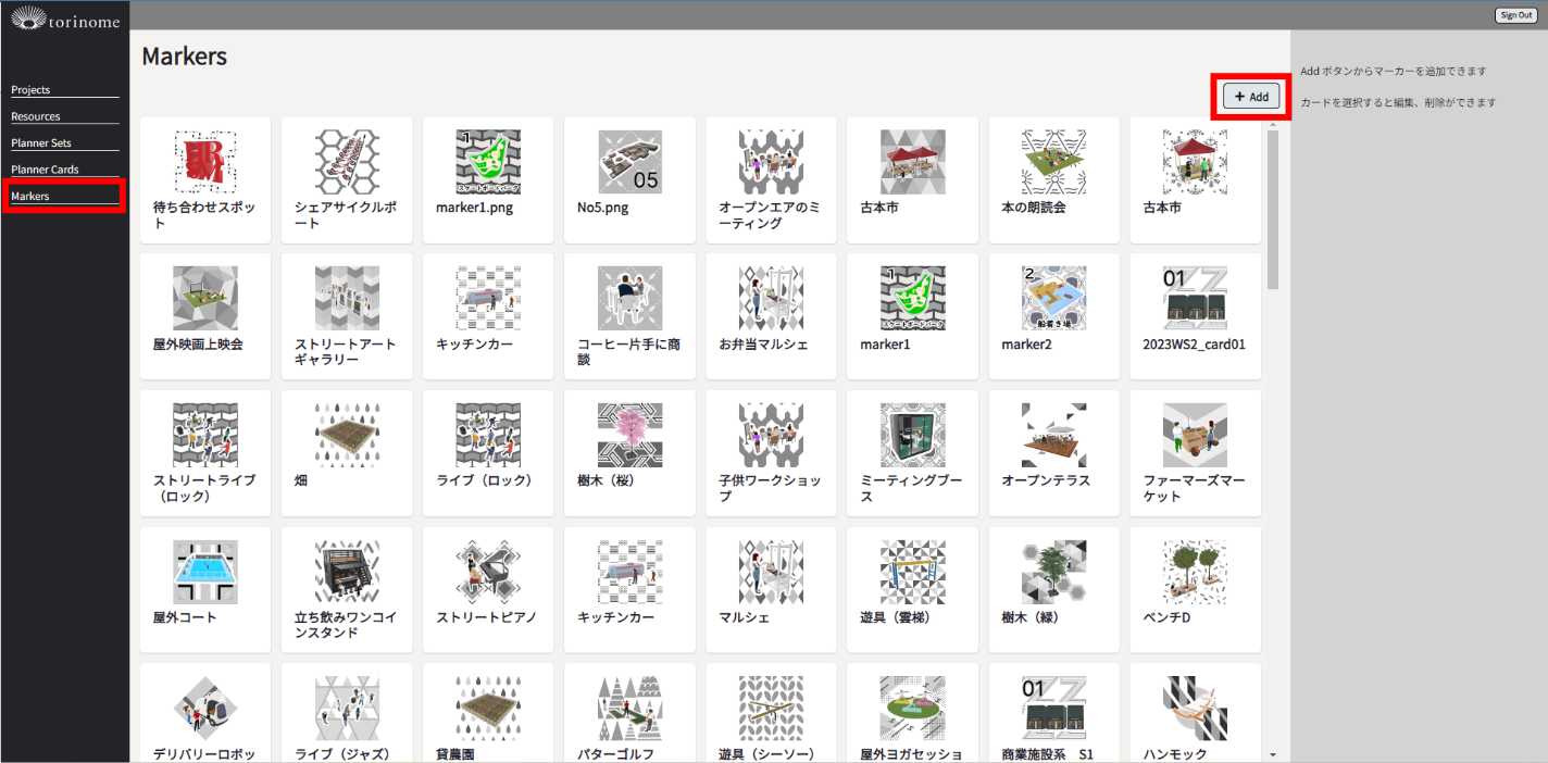 ①メニューから「Markers」を選択し、「+Add」を選択します。
