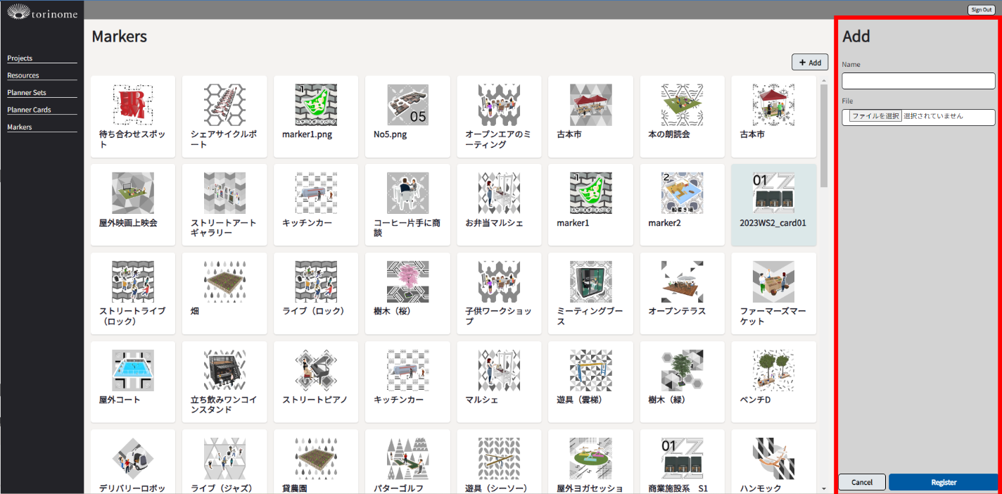 画面右側にある「Add」の「ファイルを選択」から、マーカーを選択し「Name」にマーカー名を入力し「Register」を選択します。