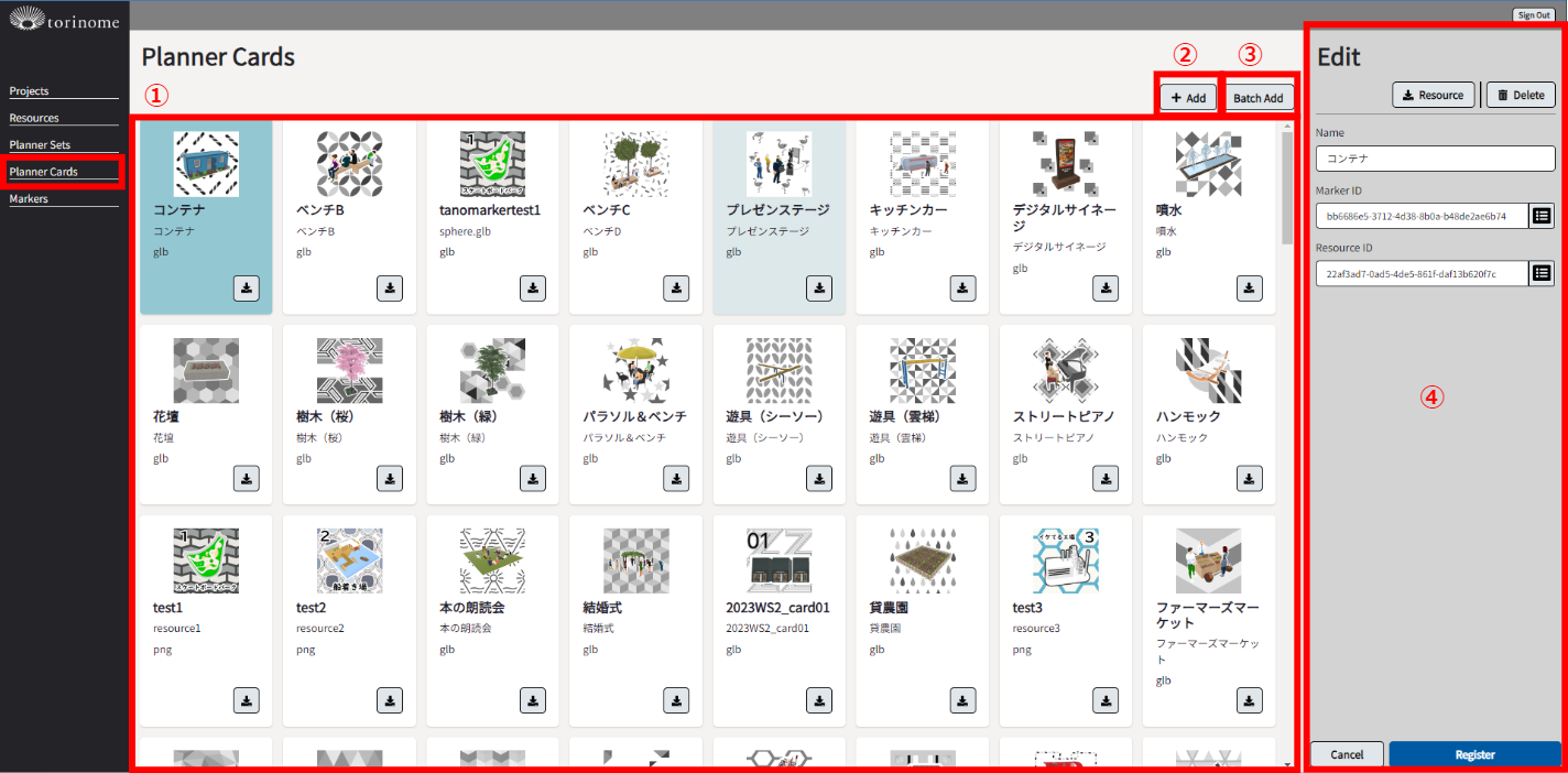 2-6-1. Planner カードの画面説明 2025年06月03日 08:19 更新 番号 項目 説明 ① Plannerカード一覧 Plannerカードの名称、サムネイル ② +Add Plannerカードの新規作成 ③ Batch add Plannerカードの一括登録 ④ Edit リソースファイルのダウンロード、削除、Nemeの変更、Markar ID、Resources IDの変更