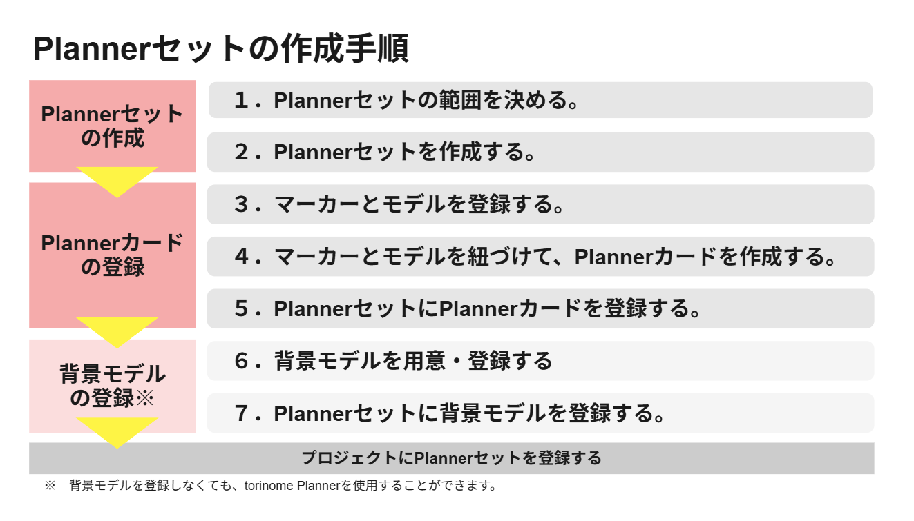 Plannerセットとは、アプリケーション「torinome Planner」を使う際に必要な「Plannerセットの設定」、「Plannerカード」、「背景モデル」等の設定が予めされたものです。