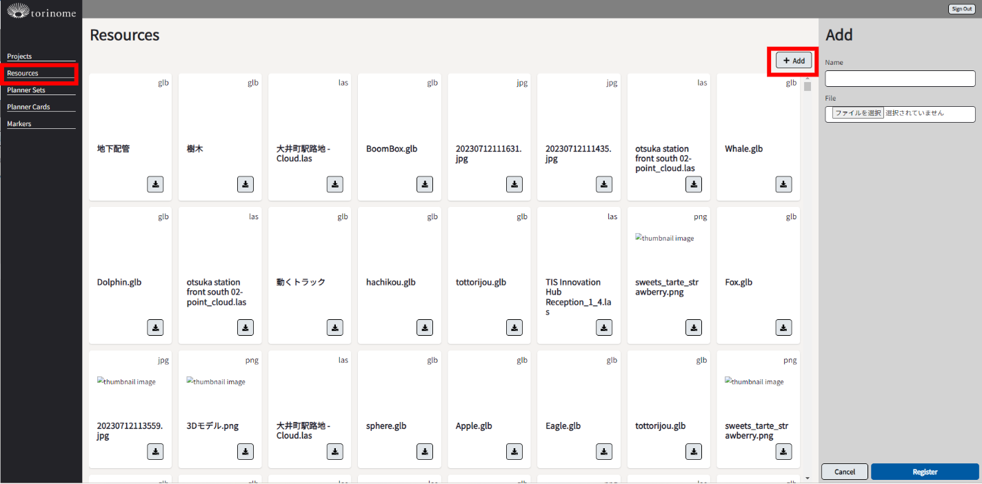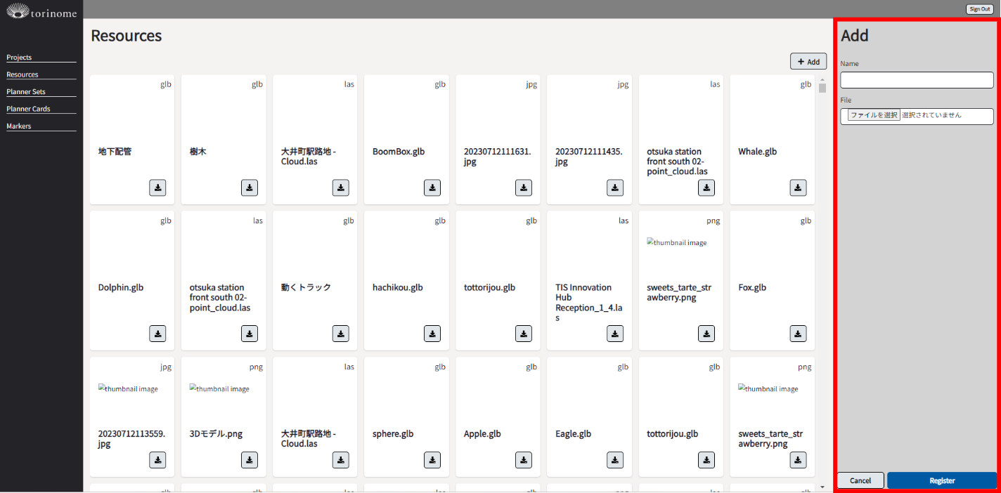画面右側にある「Add」の「ファイルを選択」から、モデルを選択し「Name」にマーカー名を入力し「Register」を選択します。