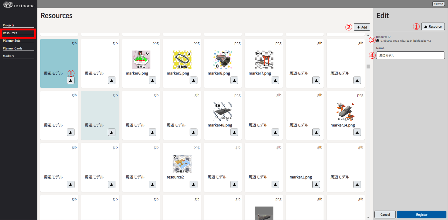 | ① | Resourceダウンロード | リソースファイルをダウンロードすることができます |