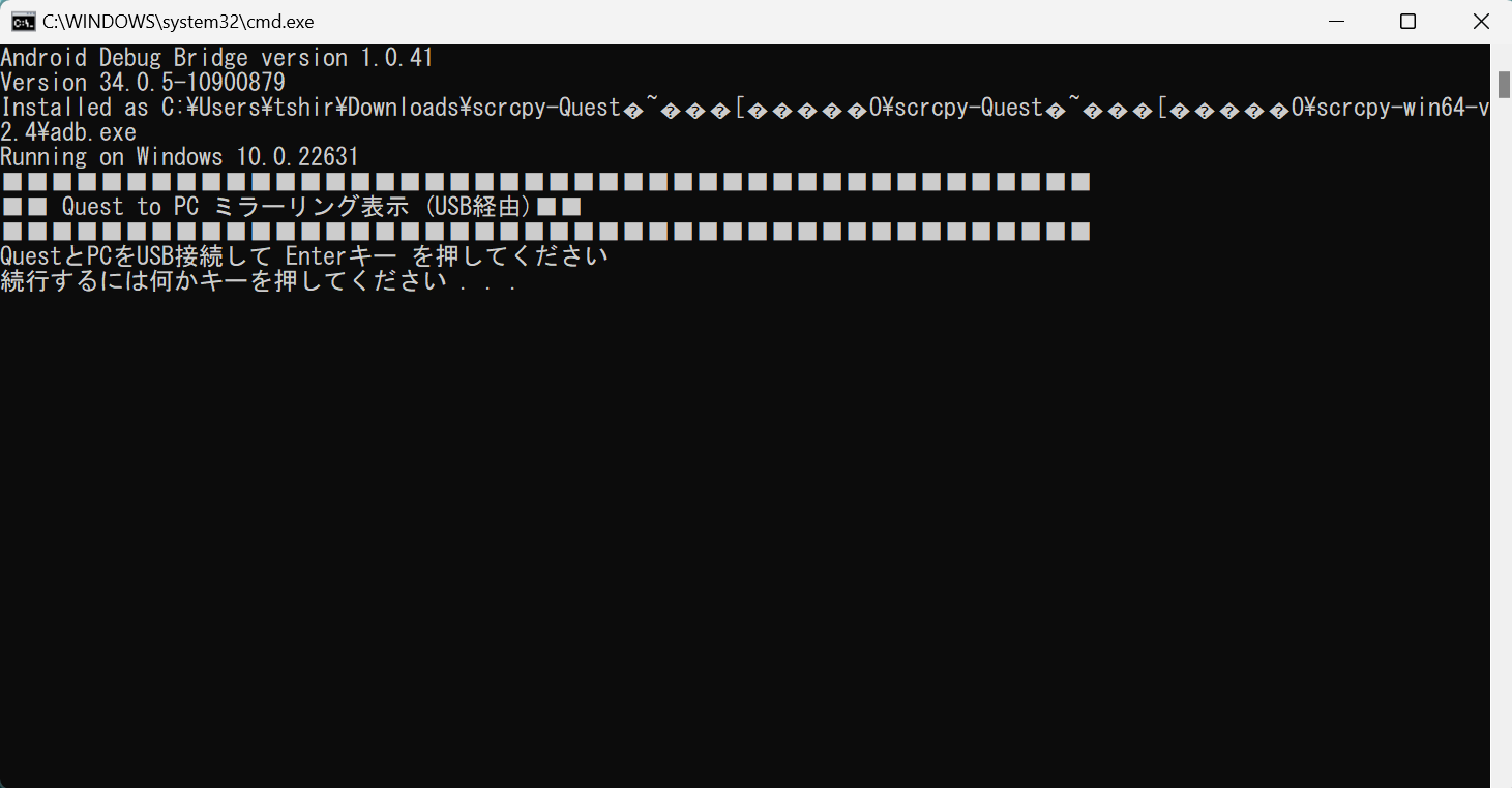 - 以下のメッセージが表示されるのでPCとQuestとの接続ケーブルを切断し「Enter」キーを押下します。この表示までは10秒程度かかります