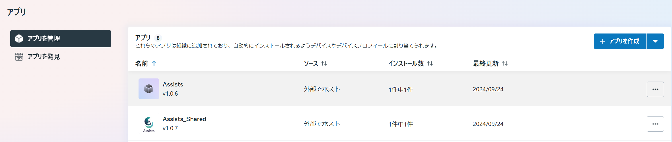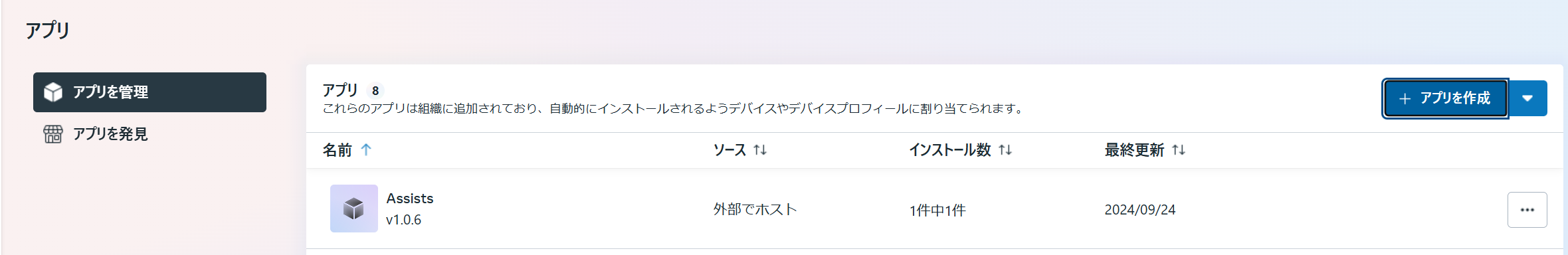 アプリの管理ではデバイスに配布するアプリケーションを設定します。