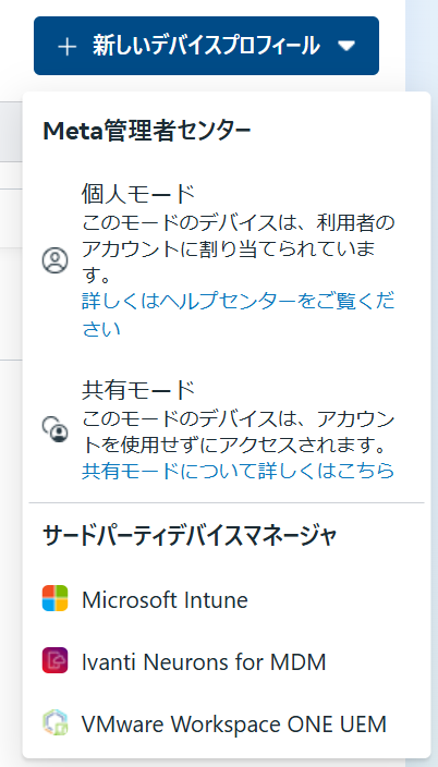 デバイスプロフィールの追加では「個人モード」「共有モード」、「サードパーティーデバイスマネージャー」から選択できます。