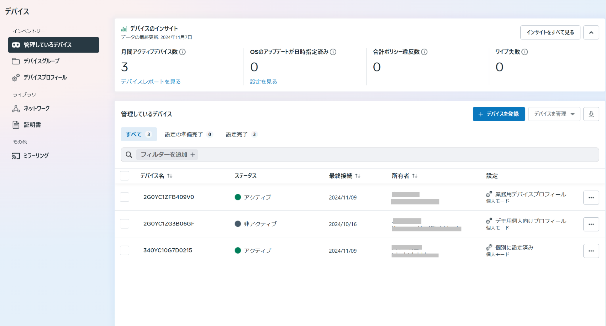 デバイス管理の管理しているデバイス にもデバイスが追加されます。