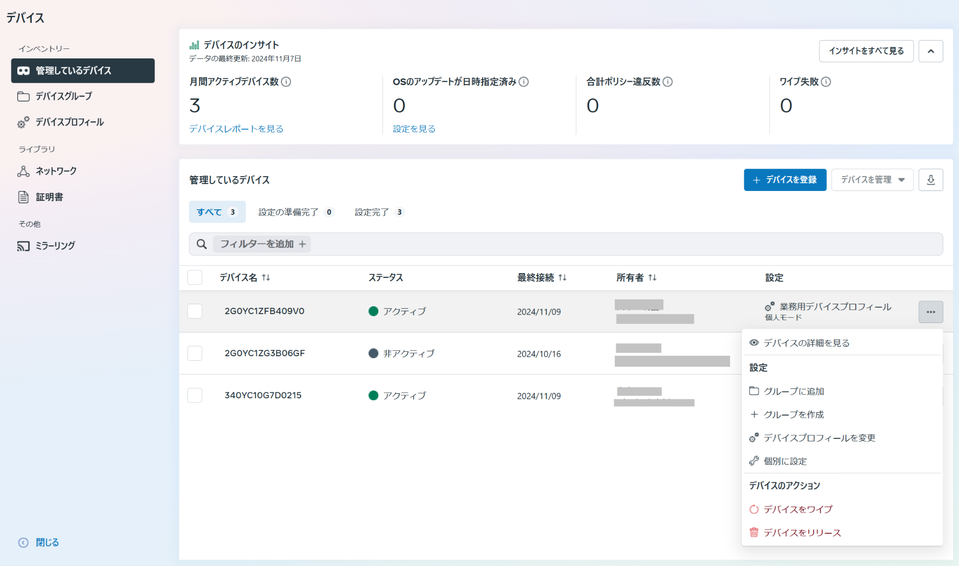 1.管理しているデバイス よりデバイスプロフィールを変更したいデバイスの「・・・」から