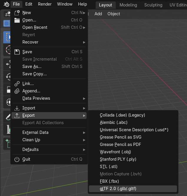 - 「File」>「Export」>「glTF 2.0 (.glb/.gltf)」を選択します
