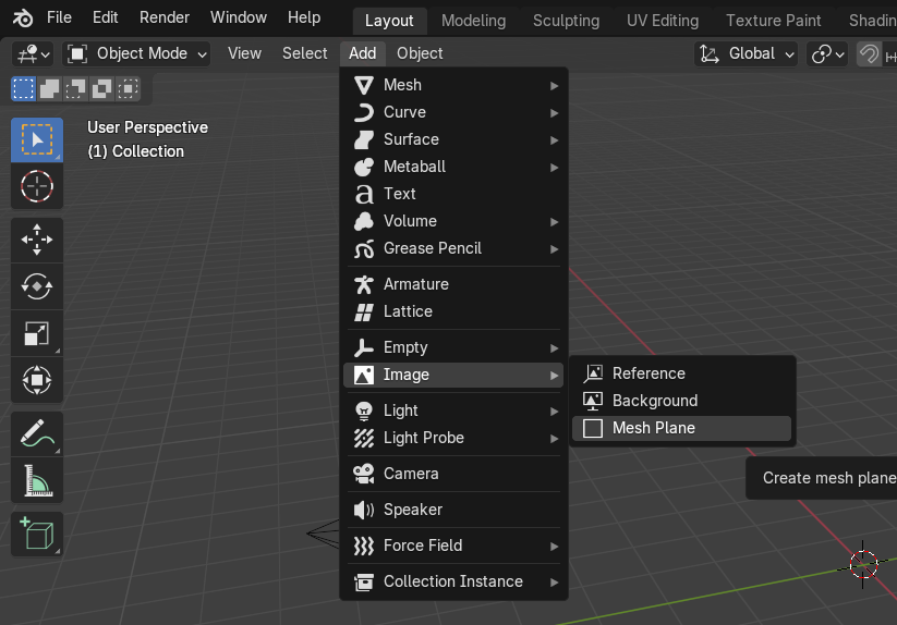 - 「Add」>「Image」>「Mesh Plane」を選択します