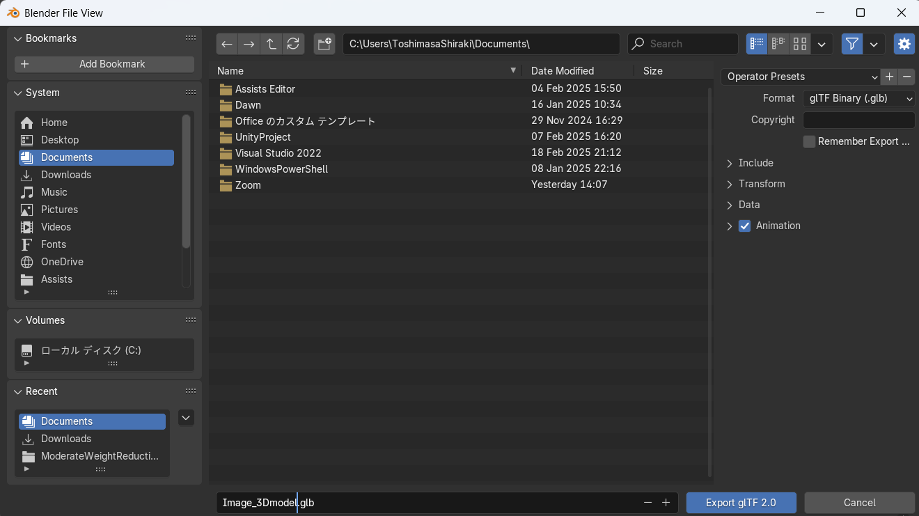 (ここでは「Documents」配下に「Image_3Dmodel.glb」というファイル名で保存)