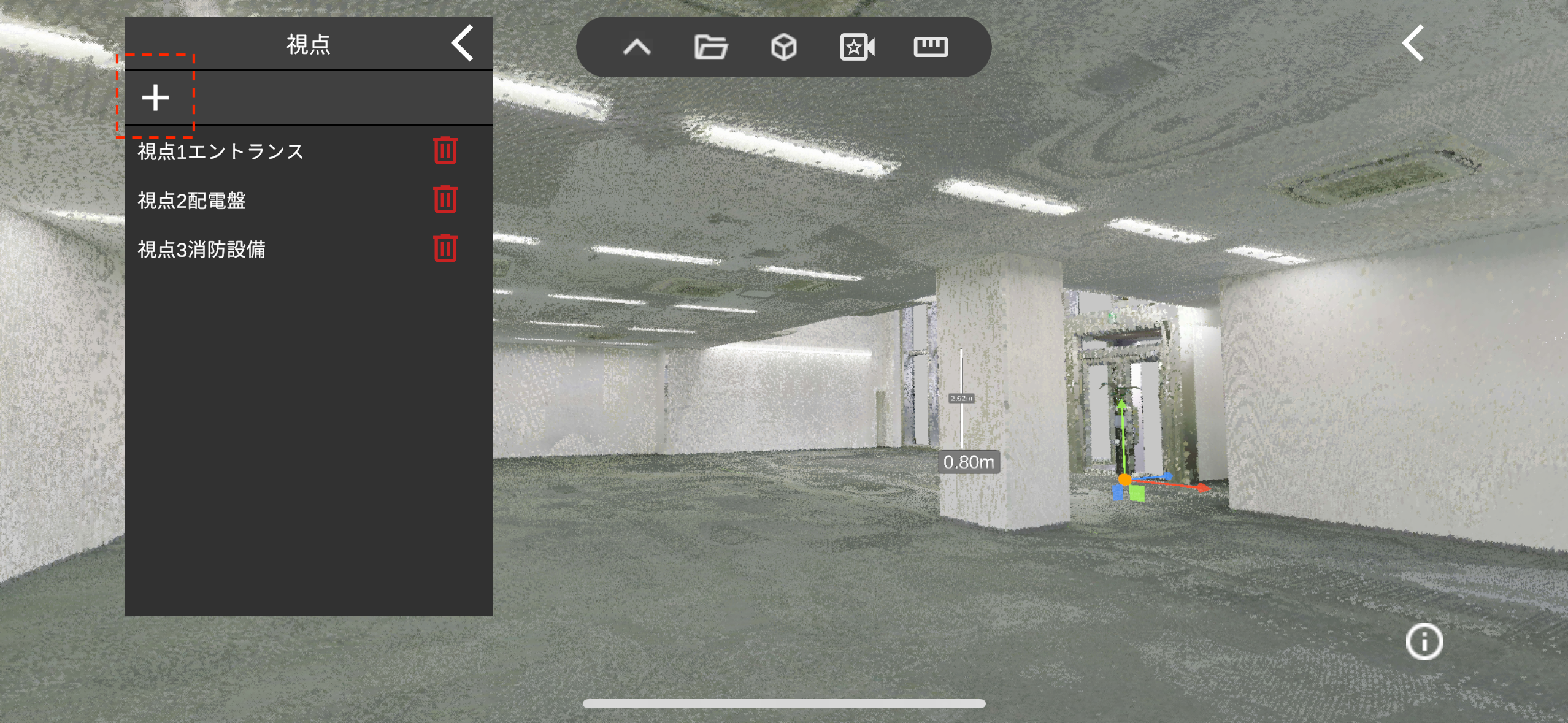 一覧から視点を選択すると、保存された位置と向きにカメラが切り替わります。