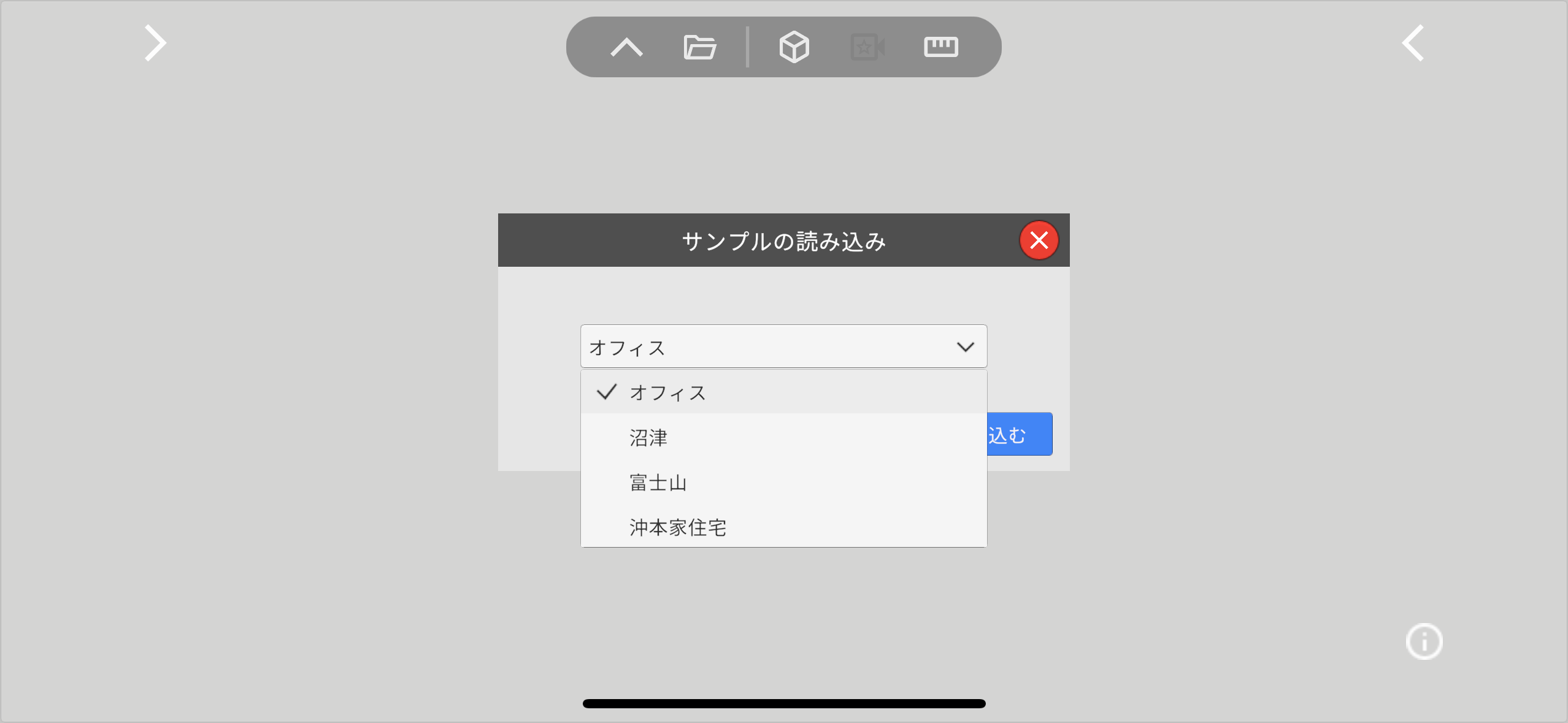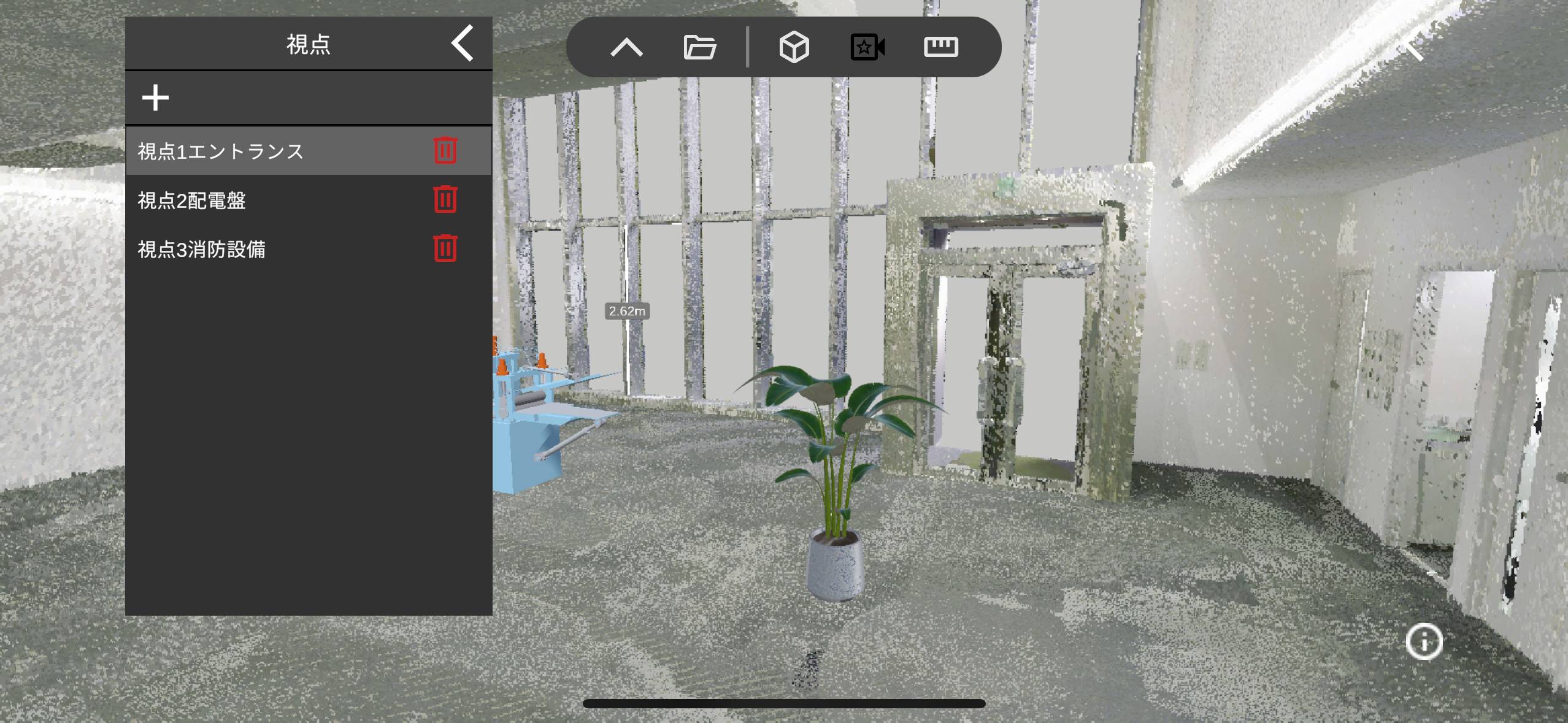 オフィスのサンプルではあらかじめ点群、3Dモデル、計測値、視点が保存されたプロジェクトが表示されます。