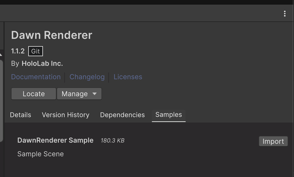 DawnRenderer のパッケージを選択し、Samples のタブから DawnRenderer Sample のサンプルシーンをインポートします。