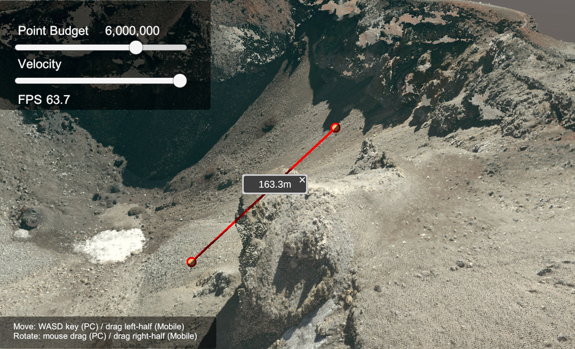 また、点群の2点を右クリックすると、距離を計測することができます。(注: URP を使用している場合、後述の設定が必要です)