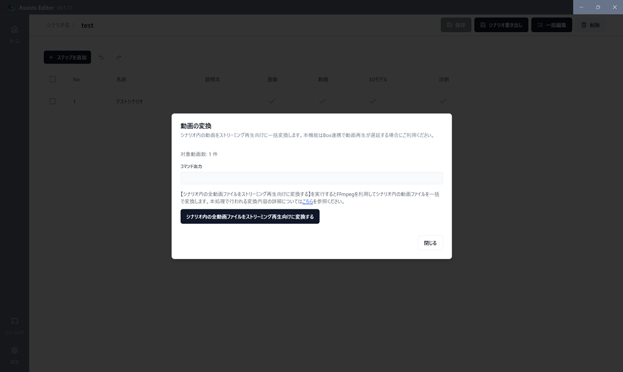 Assists Editor ver β 0.1.11 (2026/2/10) 2026年02月09日 02:26 更新 機能変更・追加シナリオ編集画面・ステップ編集画面に「Box連携向けの動画変換」機能を追加しました。本機能を実行すると、シナリオ内の動画をストリーミング再生向けの形式に変換します。 Box連携で動画再生が遅延する場合にご利用ください。 ストリーミング再生向けの動画変換の詳細については以下のマニュアルを参照ください。https://hololab.zendesk.com/hc/ja/articles/53658348835097 関連記事 2.ダウンロード 1. Box連携でシナリオを表示したとき、動画の再生が頻繁に停止する Assists Editor ver β 0.1.10 (2026/1/22) 7. Quest 3 ライセンスの登録・解除・確認の方法